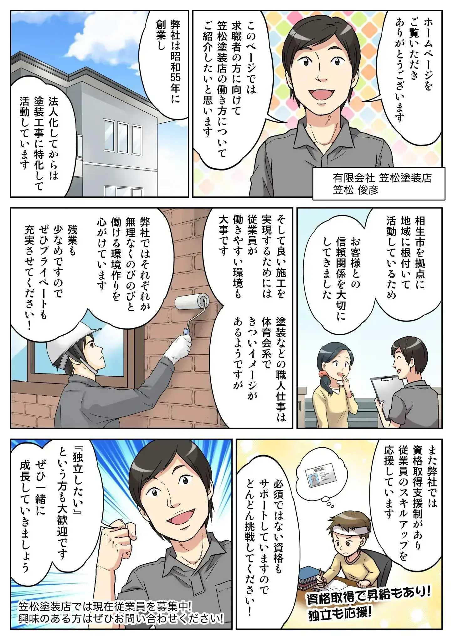 笠松塗装店では、将来的に独立を目指す方にも全力で応援します。資格取得支援などスキル向上へのサポートで、個人のキャリアアップを応援します。独立を希望する方にとって、大きなチャンスがある会社です。